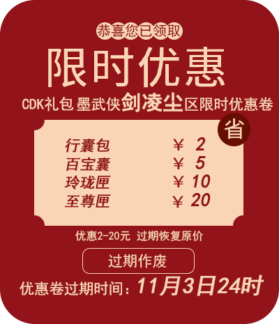 2025年11月03日24时之前参与特惠CDK预购的玩家,将可以享受行囊包CDK-2元优惠券,百宝囊CDK-5元优惠券,玲珑匣CDK-10元优惠券,至尊匣CDK-20元优惠券的福利,每人仅限一次,过期作废。